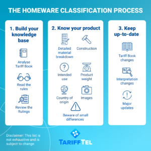 TariffTel holds thousands of item types and provides an easy-to-read breakdown of the key points relating to the classification of a given homeware product. It also offers guidance in the form of clarifying information for products which are particularly complex from a classification perspective.
